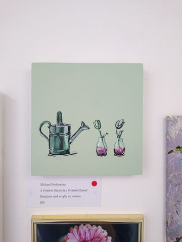 'A Problem Shared is a Problem Halved' is a series of work that charts the joy - and importance - of talking to people. This is achieved by simple still life paintings. On the surface, each painting depicts a simple scene of three items. Metaphorically, however, each item acts as a vessel that houses a problem, which becomes easier to manage as it is shared. 'A Problem Shared is a Problem Halved' is generally exhibited in group exhibitions.